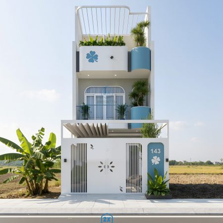 Mẫu nhà phố 3 tầng mang phong cách hiện đại – tối giản, với mặt tiền tinh tế thể hiện rõ sự trẻ trung và sang trọng. Các mảng tường phẳng, đường nét khỏe khoắn cùng tông màu trung tính giúp ngôi nhà nổi bật mà vẫn hài hòa với tổng thể khu phố.